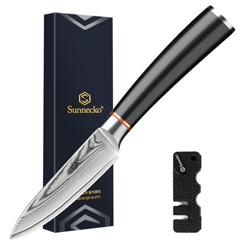 Sunnecko Damascus Paring Knife, Japanese VG10 Core Steel Damascus Fruit Knife,Professional Razor Sharp Small Kitchen Knives with Knives Sharpner