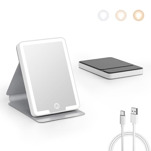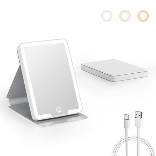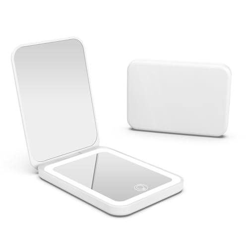 Kintion Rechargeable Compact Mirror, Portable LED Pocket Mirror, Travel Mirror with Light, 3 Color Modes Dimmable, Folding, Handheld, Purse Small Mirrors for Women Gift, White