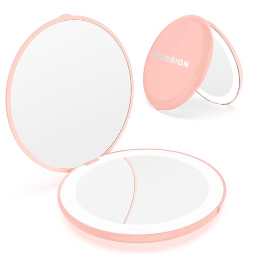 WOBSION Compact Mirror with Light, 1x/10x Magnifying Travel Makeup Mirror, LED Pocket Mirrors for Purse and Handbag, Handheld 2-Sided Small Folding Mirrors, Round, Pink