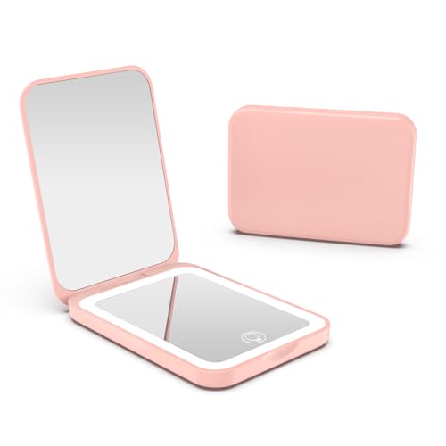 WOBSION Travel Makeup Mirror with Light, Dimmable Compact Mirror for Pocket, Small Mirrors for Handbag, 1x/3x Magnifying Portable Led Mirrors for Women, Rechargeable, Gifts for Girls, Pink