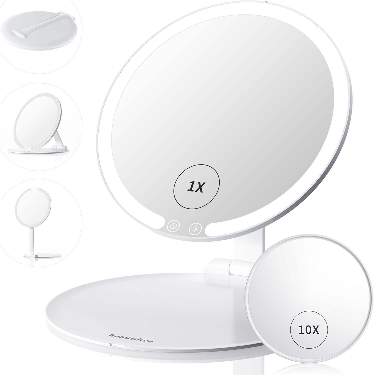 Beautifive LED Travel Lighted Makeup Mirror with 10 Magnifying Small Mirrors, Rechargeable Portable Hall Sensor Light up Mirror with Adjustable Stand, 3 Colors Modes and Stepless Brightness