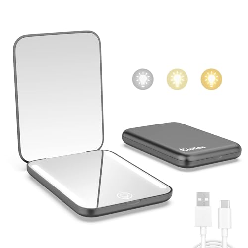 Kintion Rechargeable Compact Mirror, Portable LED Pocket Mirror, Travel Mirror with Light, 3 Color Modes Dimmable, Folding, Handheld, Purse Small Mirrors for Women Gift, Black