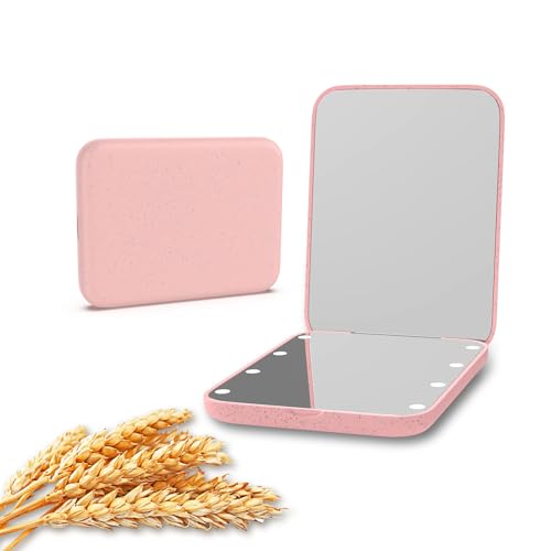 Kintion Wheat Straw Mirror, 1X/3X Magnification Pocket Mirror, Plastic Fiber, Handheld Folding Purse Mirrors, Small Lighted Compact Mirror for Gift, Pink