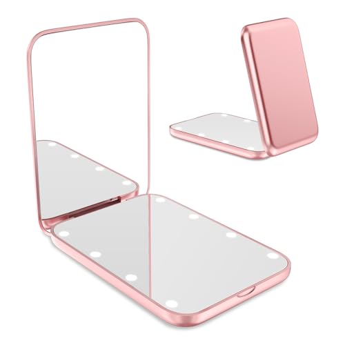 WOBSION Compact Mirror, Small Makeup Mirrors with Light for Travel, LED Pocket Mirror for Purse and Handbag, 1x/3x Magnifying Handheld Mirrors, Folding, Portable, Gifts for Women, Rose Gold