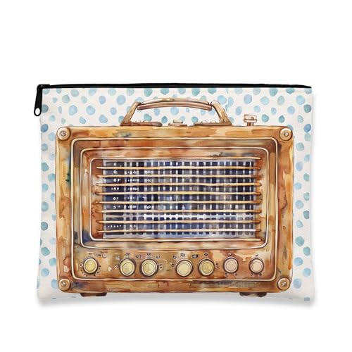 Vintage Radio Makeup Bag, Retro Style Cosmetic Travel Pouch for Women, Portable Small Canvas Zipper Organizer, for Festivals, Beige, 7x9 Inch, Radio