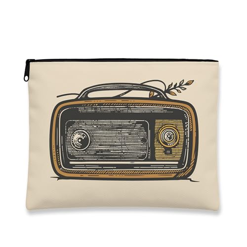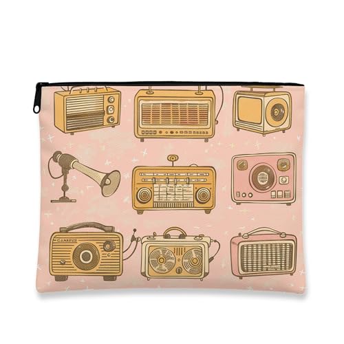 Retro Vintage Makeup Bag, Classic Radio Pattern Cosmetic Travel Pouch for Women, Portable Small Canvas Zipper Organizer, Gift for Music Lovers, Beige, 7x9 Inch, Pouch