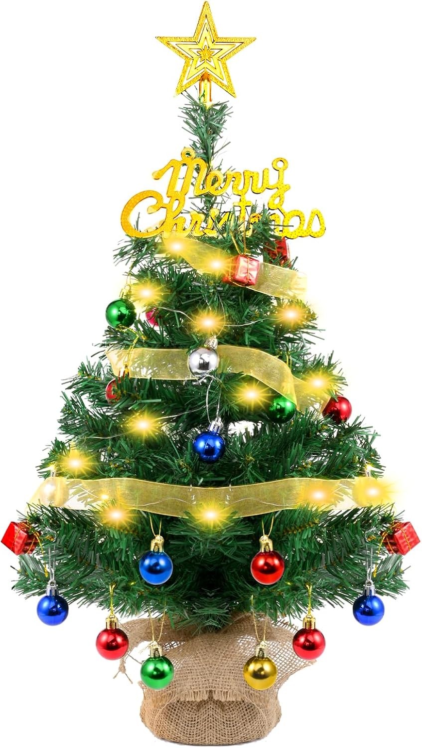 BAIEGOED Small Table Top Christmas Tree 60cm, Prelit Mini Artificial Xmas Tree,