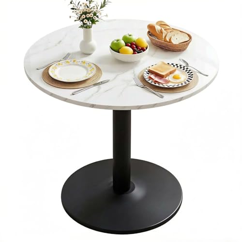 Warmiehomy Wood Dining Table, 80cm Modern Small Round Dining Room Table for Home Apartment Kitchen Living Room, White Marble-Patterned Wooden Desktop and Black Metal Base