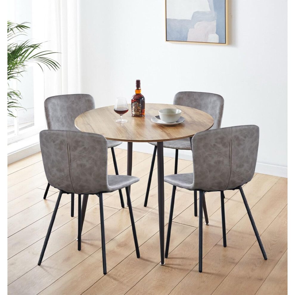 Hallowood Furniture Cullompton Small Round Dining Table and Chairs Set 4, Brown Oak Effect Top Kitchen Table and Chairs in Upholstered Taupe Faux Leather with Metal Legs for Home, Office & Café