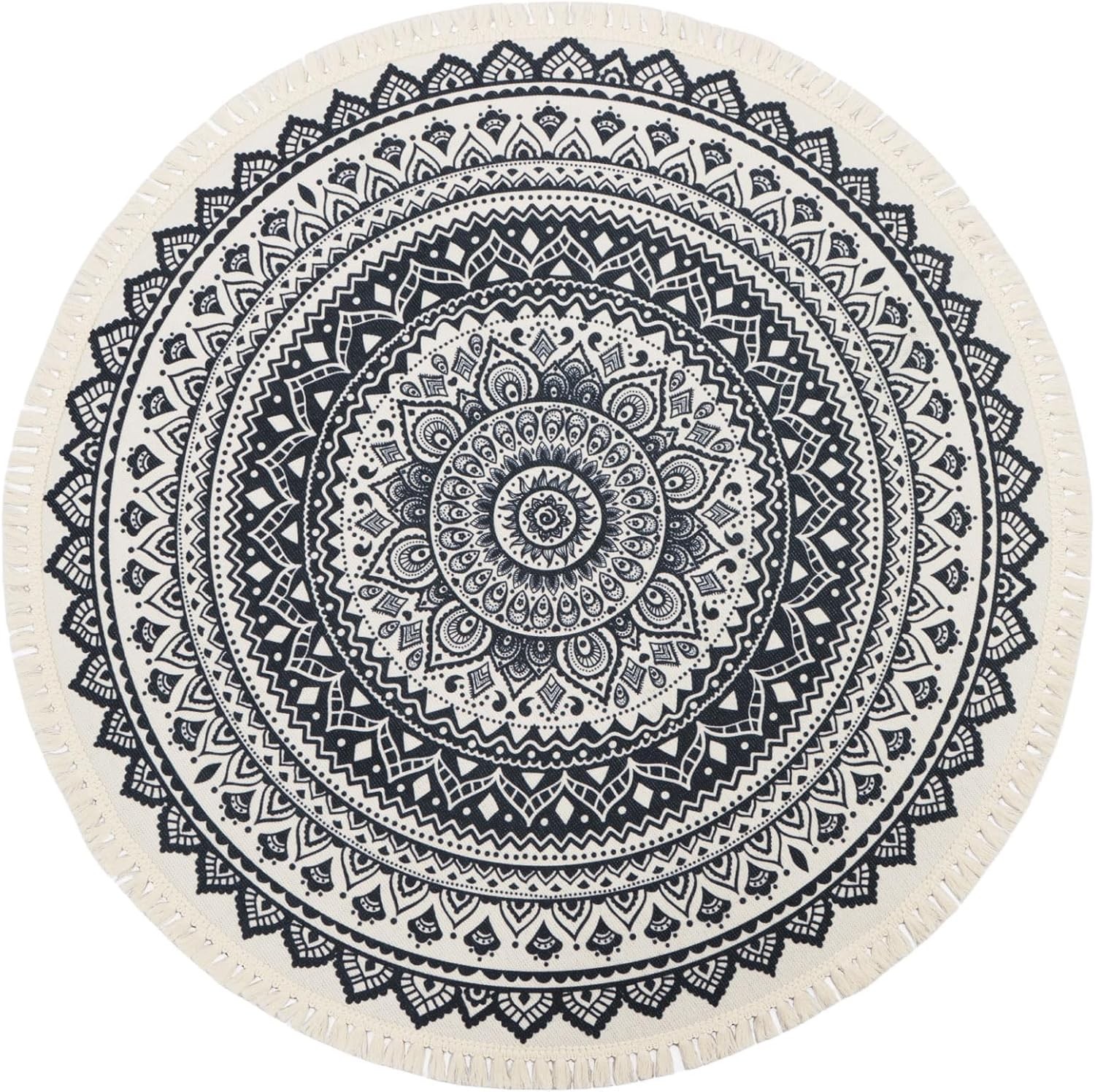 Uphome Small Round Rug 2.3’ Black Mandala Boho Bathroom Rugs with Pom Poms Fringe Washable Circle Shower Mat Soft Non-Slip Cute Circular Throw Rug for Sink Powder Room Bedroom Kids Room Nursery