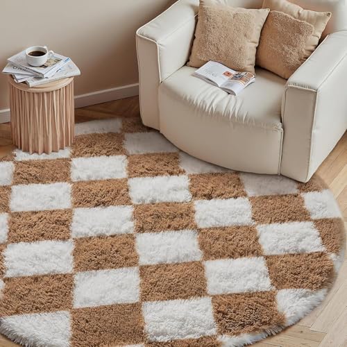 HUGEAR Fluffy Checkered Round Rug 120cm Brown and White Bedroom Circle Small Carpet Thick Shaggy Soft Area Rugs Kids Girl Room Decor Lounge Nursery Plush Carpets