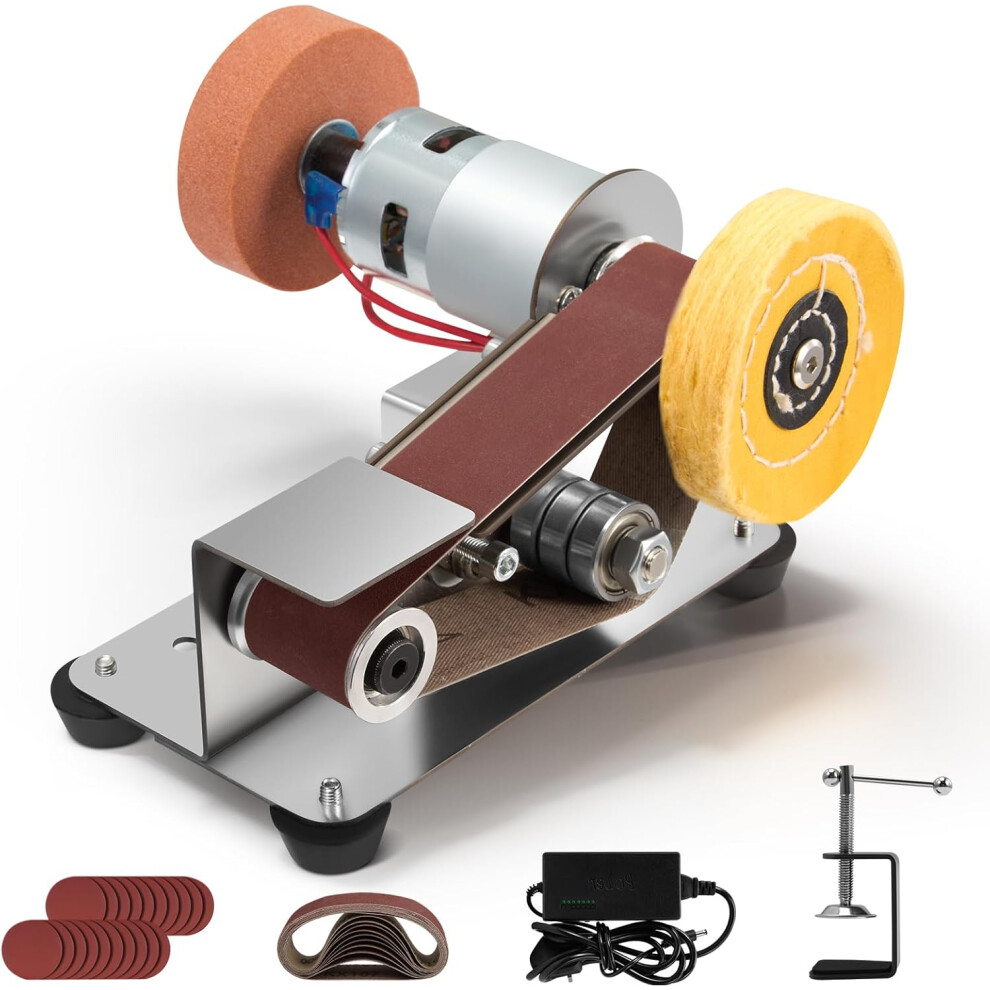 Mini electric belt sander, small table-mounted electric belt sander with fixed clamp, polishing wheel, polishing wheel for DIY woodworking and metalwo