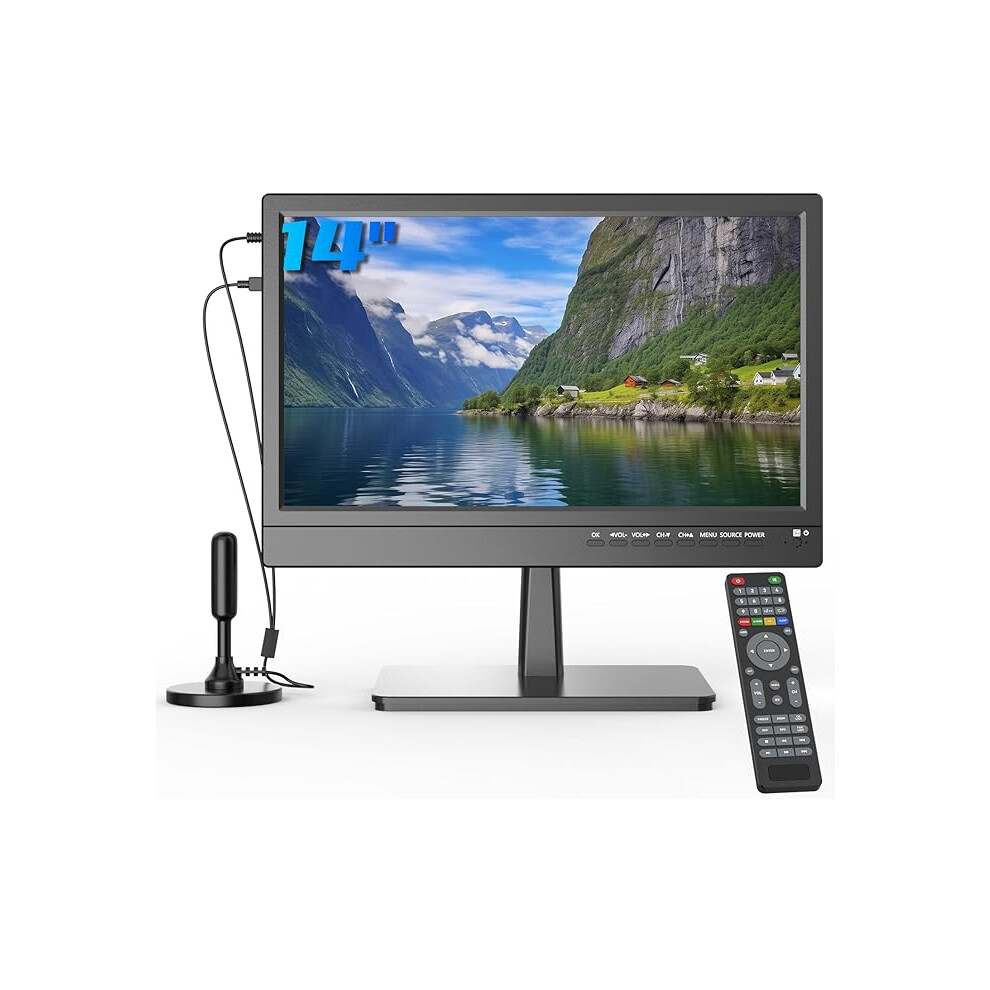 ZOSHING 14" Small 1080P screen TV with freeview Reception and Aerial,Two Power AC/DC-12V,HDMI-USB-VGA Input Ports for Camper/Monitors/kitchens