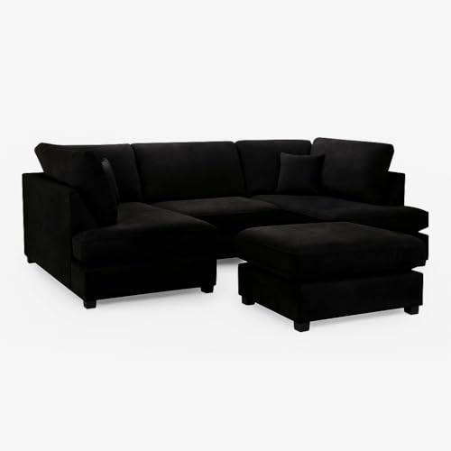 Small U Shape Sofa - Comfortable U Shaped Full Back Couch - Cinema 4pc High Back Couches - Modern 6 Seater Corner Settee - Soft Plush Velvet Fabric Sofas with Footstool Sofabed for Living Room (Black)