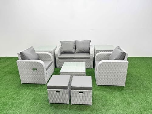 FMSGarden Light Grey PE Wicker Rattan Garden Furniture Set Sofa Set Reclining Adjustable Chair Square Coffee Table 6 Seater 2 Small Stools Side Table