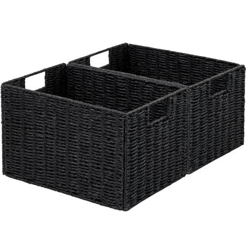Vagusicc Wicker Storage Basket, Set of 2 Hand-Woven Paper Rope Wicker Basket, Small Storage Baskets for Organizing Toilet Paper Baskets, Foldable Large Cube Storage Organizer Bin for Shelves (Black)