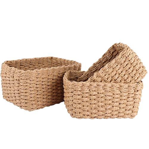 ASelected 3Pcs Wicker Baskets, 3Size Woven Paper Rope Storage Boxes, Small Wicker Storage Baskets for Shelf Cupboards Drawer Closet