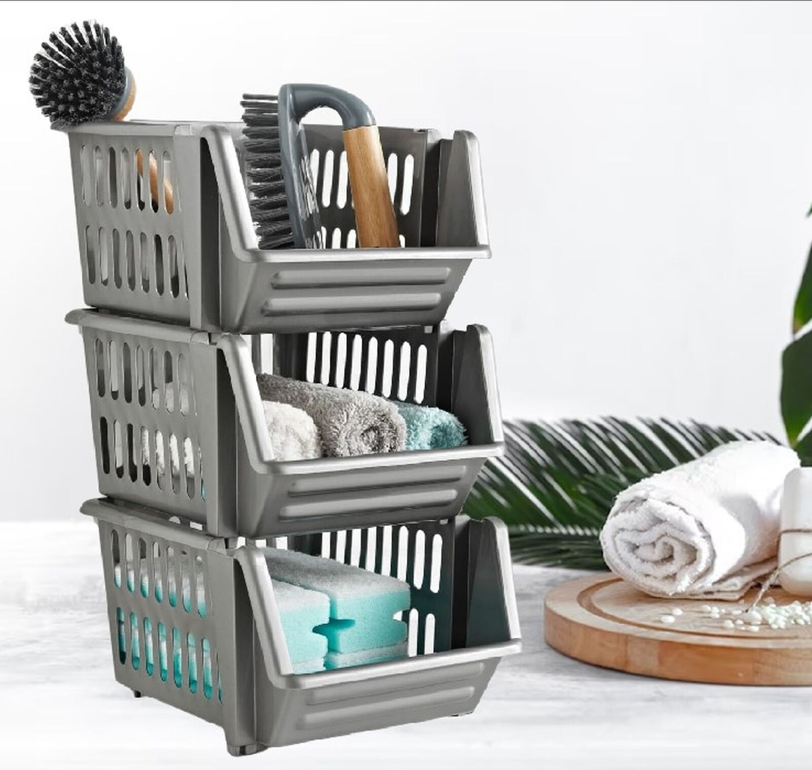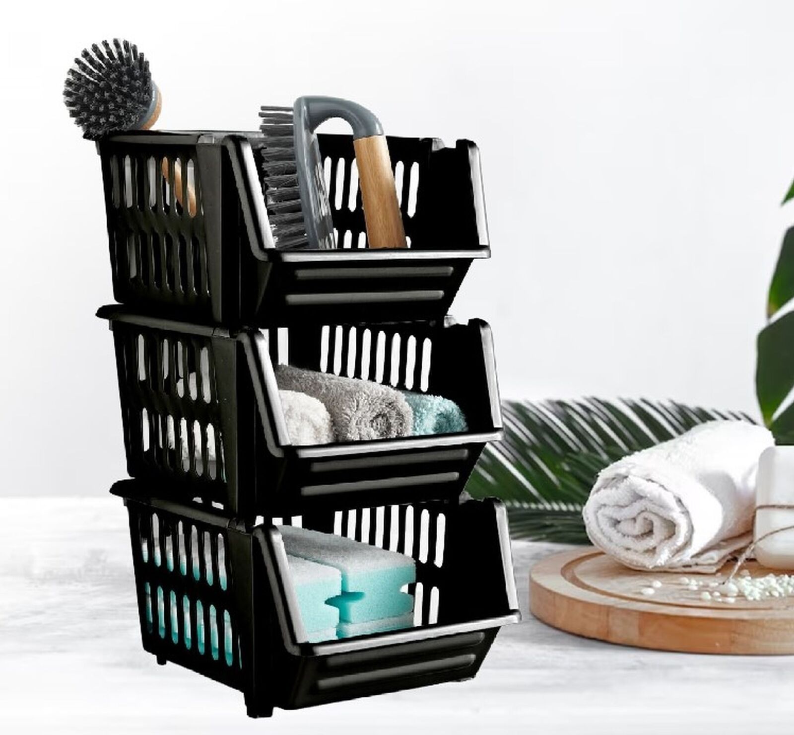 Small Stacking Storage Baskets 3 Tier Black Veg Rack Home Kitchen Office 21cm
