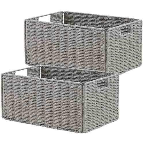 Vagusicc Wicker Storage Basket, Set of 2 Hand-Woven Paper Rope Wicker Basket, Small Storage Baskets for Organizing Toilet Paper, Foldable Large Cube Storage Organizer Bins for Shelves (Grey)
