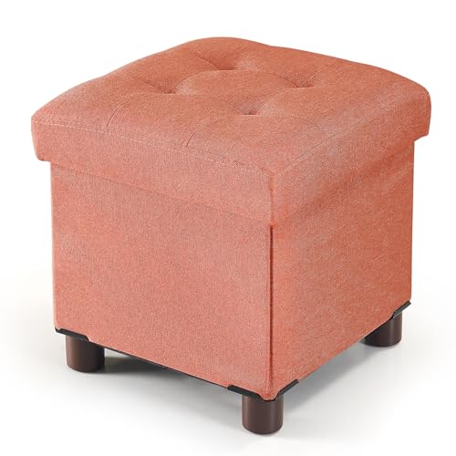 BRIAN & DANY Small Ottoman Storage Box 32x32x32.5cm, Linen Foot Stool with Wood Legs, Footstool with Lid for Livingroom Bedroom, Orange