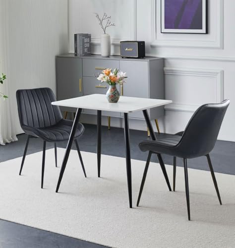 Homullel 75x75 cm Small Dining Table and 2 Chairs, 2 Seater Table and Chairs Set Kitchen Dining Room Set for 2, Compact, Space Saving, Wooden, Glossing Tabletop Marble-White (2 Seats, Linen Black)
