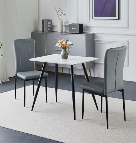 75x75 cm Small Dining Table and 2 Chairs, 2 Seater Table and Chairs Set Kitchen Dining Room Set for 2, Compact, Space Saving, Wooden, Glossing Tabletop Marble-White (2 Seats, Faux Leather Grey #1)