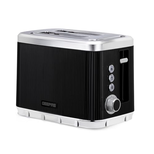 GEEPAS 2 Slice Toaster | 6 Browning Levels Cancel Defrost Reheat | For Thin Small Bread Slice Removable Crumb Tray Cool Touch Housing High Lift | Space-Saving Design | 2 Yr Warranty 1000W Black Fluted