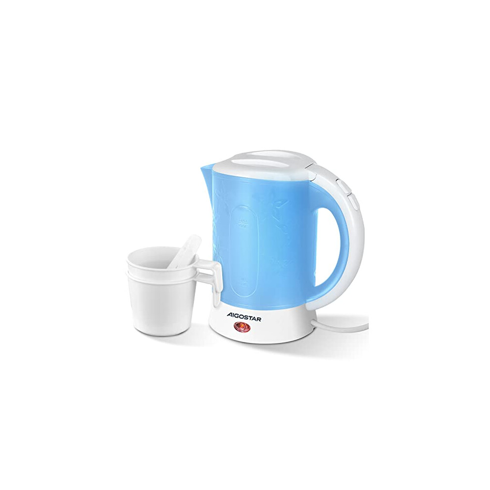Aigostar Small Travel Electric Kettle - 650W 0.6 Litre Lightweight, Low Wattage Mini Portable With 2 Cups and 2 Spoons for Seniors, Elderly, Camping, Bedroom - Fast Boil, BPA Free, Blue