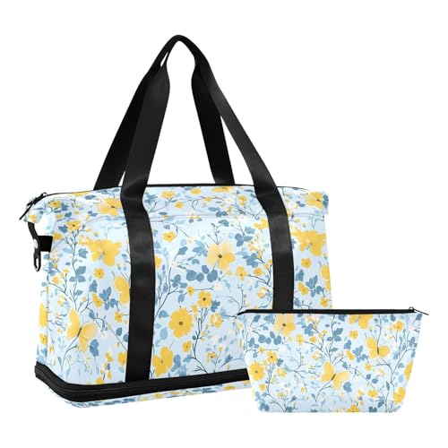 Travel Carry on Weekender Overnight port gym bag with Adjutable trap for Trekking Large Capacity, multi-small flowers butterflies yellow and light blue