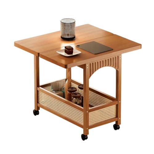 YCKEGEW Solid Wood Mobile Folding Side Table,Kitchen Small Dinner Tables Portable Rolling Desk On Wheels,360°Swivel TV Tray Table For Small Spaces(Tea brown)