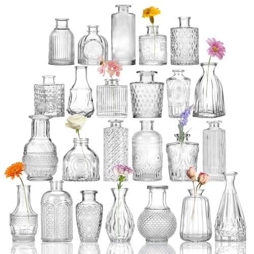 CUCUMI 24 Glass Bud Vase Set, Small Vases for Flowers, Clear Bud Vases for Centerpieces Mini Flower Vases in Bulk for Rustic Wedding Decorations Vintage Look Home Table Decor