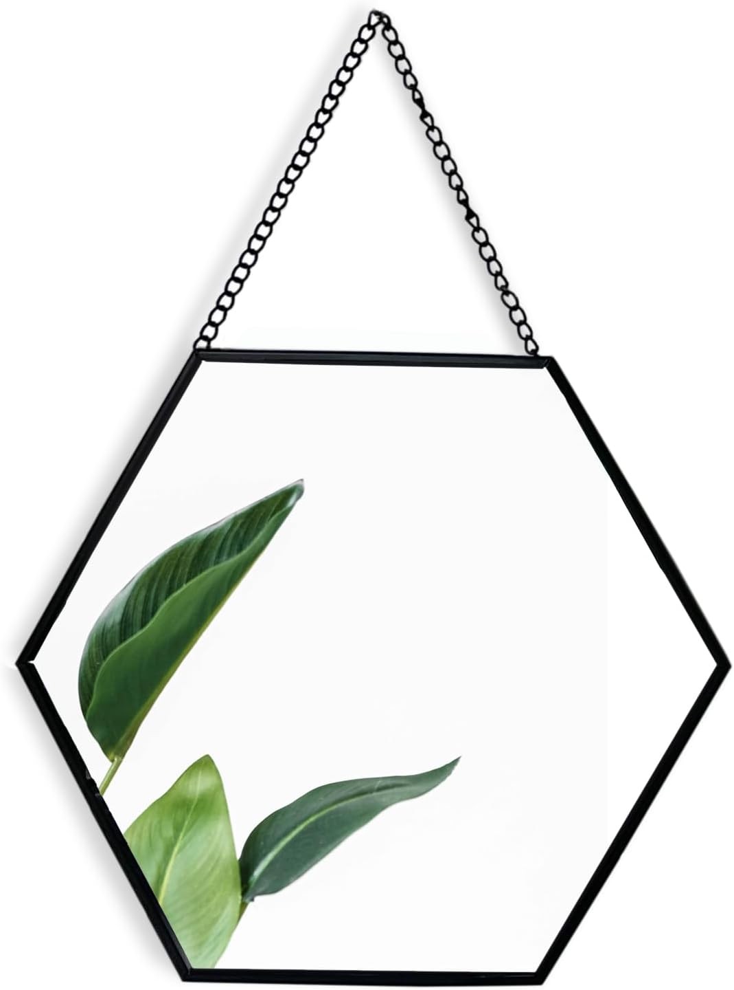 Black Hexagon Small Wall Mounted Mirror with Hanging Chain and Metal Frame (Bla
