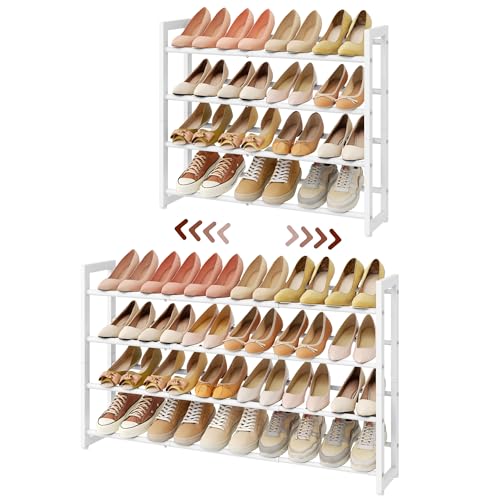 FAVOOSTY 4 Tier Shoe Rack Extendable Metal, Small Shoe Storage Organizer for Closet Inside Wardrobe, Slim Stand Shelf for Narrow Space Under Stairs Hallway, White