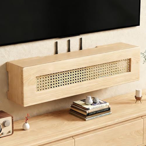 LIMENQIN Floating Router Storage Box, Wall Mounted WiFi Router Hidden Box, Cable Management Organizer, Rattan Door, Easy Assembly, Decorative Small TV Stand(Natural,60x11.5x23cm)