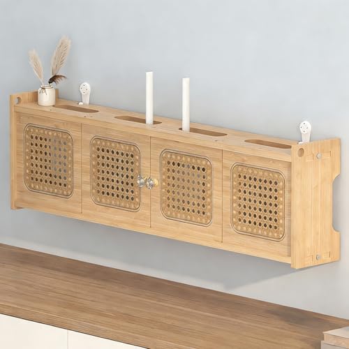 LIMENQIN Wall Mounted WiFi Box Hider, Rattan Router Storage Box, Floating Decor Router Shelf, Magnetic Door, Cable Router Cover, Small TV Stand for Living Room