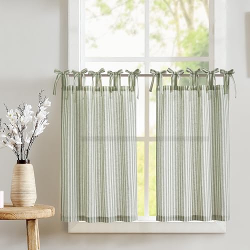 TOPICK Green Striped Linen Blend Kitchen Curtains for Living Room Bathroom Cupboard Bedroom 24 Inch Drop Pinstripe Cafe Small Window Curtains Light Filtering Tie Top 2 Panels