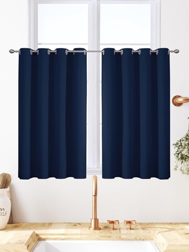 VEHEDE Blackou Short Small Window Curtains 33 Inch Drop, Eyelet Thermal Insulated Navy Curtain for Cafe, Soft Kitchen Curtains, Bedroom Curtain & Drapes, W46 x L33 Inch, Navy Blue, 2 Panels