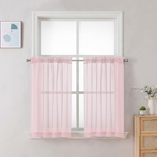 Chyhomenyc Sheer Curtains 24 Inch Length, Small Window Curtains for Bathroom Living Room Basement, Voile Short Rod Pocket Curtain Tiers, 42in Wx 24in L, 2 PCS, Blush Pink