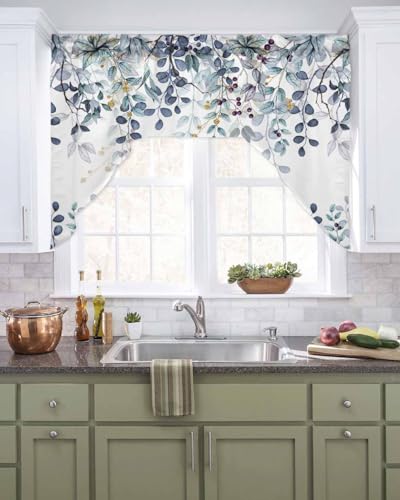 Blue Eucalyptus Leaves Swag Valances for Kitchen Window, Small Swag Curtains Valances for Bedroom Bathroom Over Sink Watercolor Summer Botanical Rod Pocket Window Treatment Drapes, 56x36 Inch