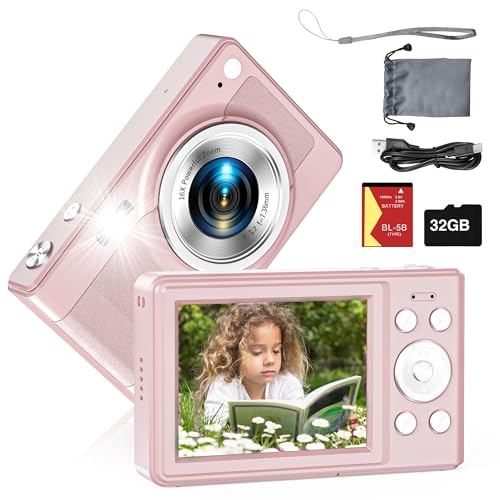 Upgrade Digital Camera, 56MP FHD 1080P for Kids with 16x Zoom Anti Shake, 32GB TF Card, Two Batteries, Lanyard, Compact Small for Boys Girls (Pink)