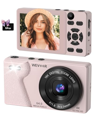 Wevoor Digital Camera 4K 64MP Autofocus Compact Camera for Vlogging with Dual Lens, 18X Digital Zoom, 2000mAh Battery, 2.8" Screen, 64GB Small Pocket Camera for Beginner Adult Travel Photography, Pink