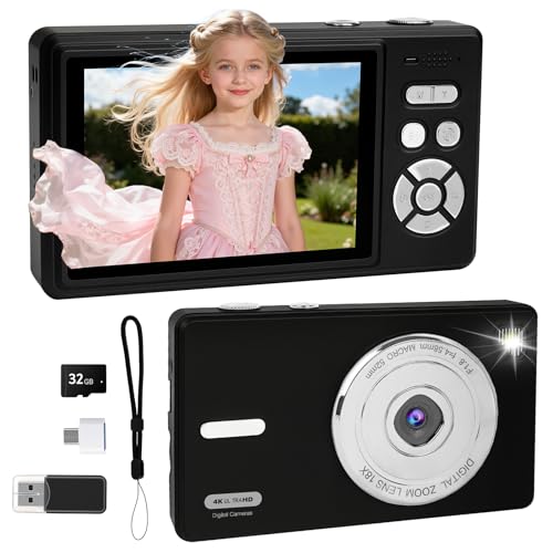 Digital Camera 4K 64MP Compact Camera with Dual Lens,2000mAh Battery,2.8" IPS Screen,18X Digital Zoom,32GB Micro SD Card and OTG Adapter Auto-Focus Small Camera for Kids,Teenagers,Beginners(Black)