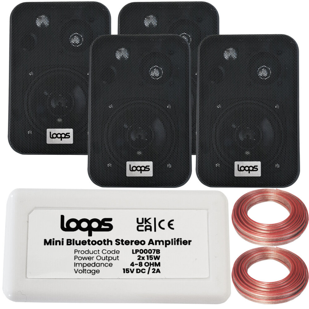 SMART HOME Bluetooth Amplifier & 4 Black Wall Mount Speaker Kit Compact HiFi Amp