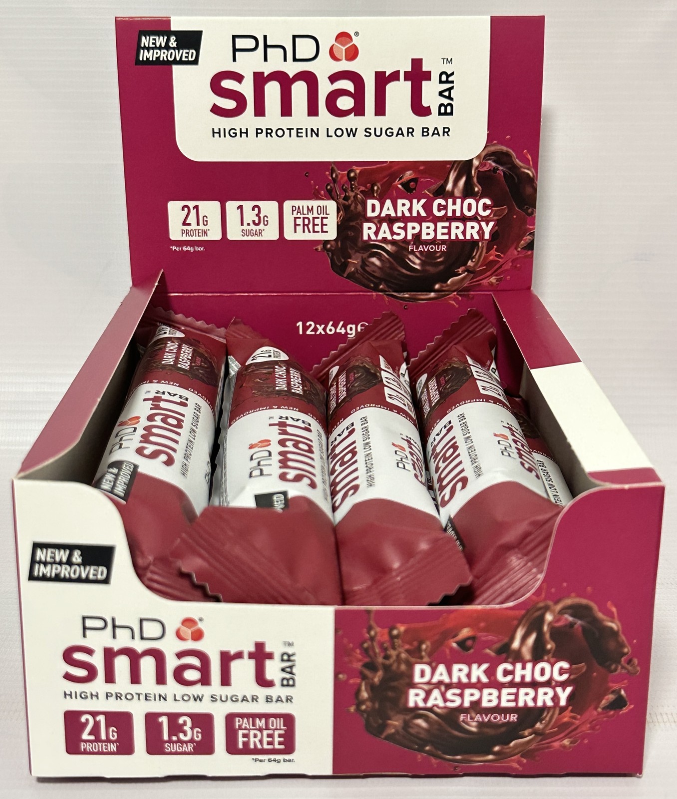 PhD Smart Bar Dark Choc Raspberry 12x64g | 21g Protein | Low Sugar Snack Box