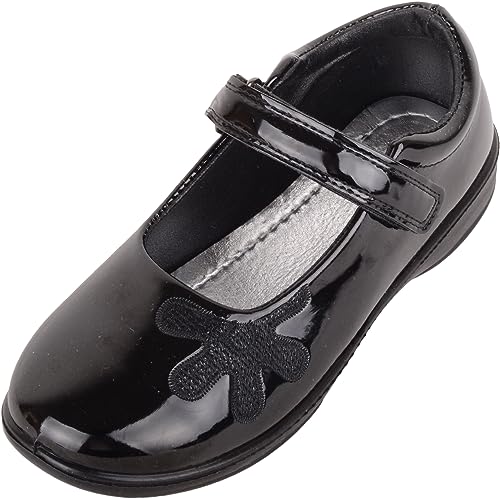 ABSOLUTE FOOTWEAR Childrens Kids Girls Faux Patent Leather Floral Touch and Close Bar Smart Formal School Shoes - Black Patent - UK Child 11 / EU 29