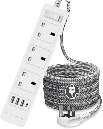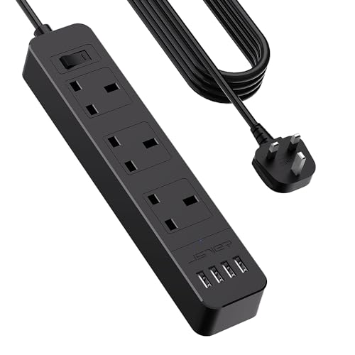 JSVER Extension Lead with USB Slots, 5M Power Strip 3250W 13A with 3Way and 4 USB Smart Charging Ports Desk Power Socket with Switch for Home Travel-Black