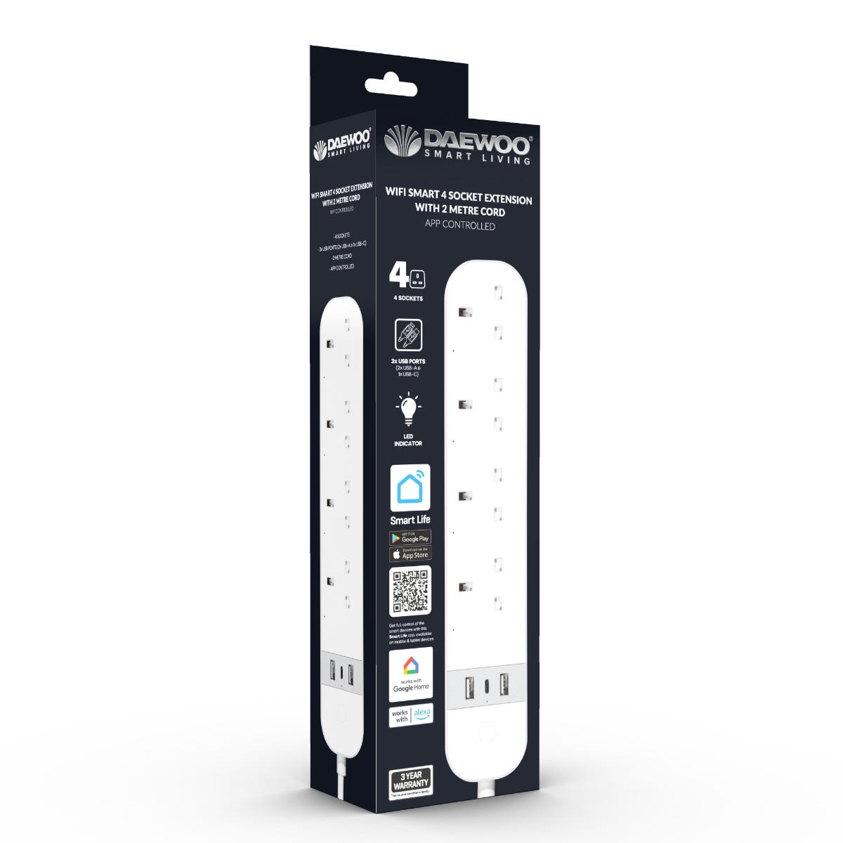 Daewoo Four Way Extension Lead Socket 4 Gang Alexa Google Smart Power Strip USB