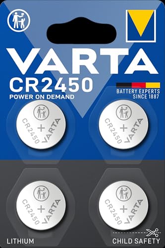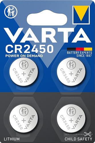 VARTA 4 x CR2450 Button Cell Batteries Power on Demand Lithium 3V Child Safe Packaging for Smart Home Devices, Car Keys and Other Applications