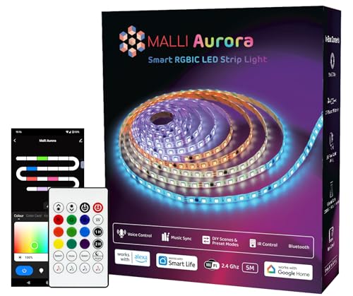 Samraj Technologies Malli Aurora Smart RGBIC LED Strip Light, 5m, Wi-Fi and Bluetooth, Works with Alexa and Google Assistant, App Control, Music Sync, Multicolour, IR Remote (5M)