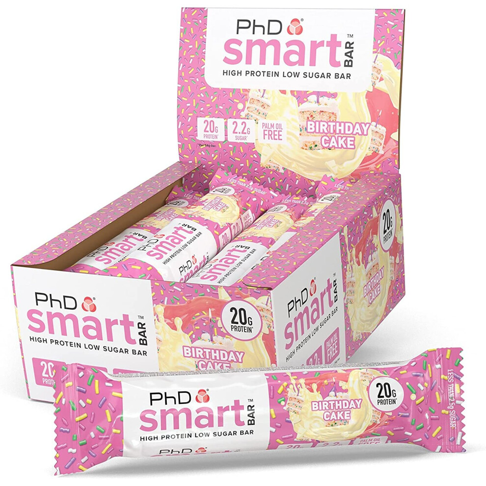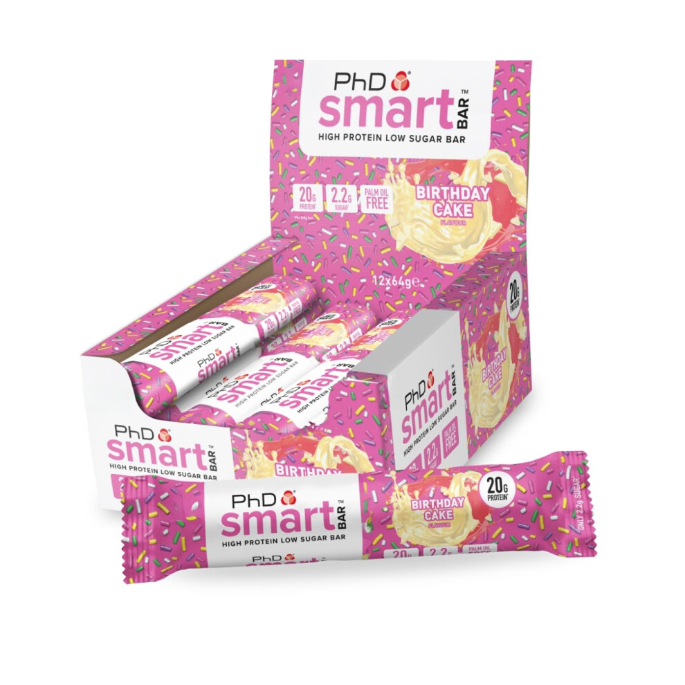 PhD Nutrition Smart Protein Bar, High Protein Low Sugar Protein Snacks, Birthday Cake Flavour, 20g of Protein, 64g Bar (12 Pack)